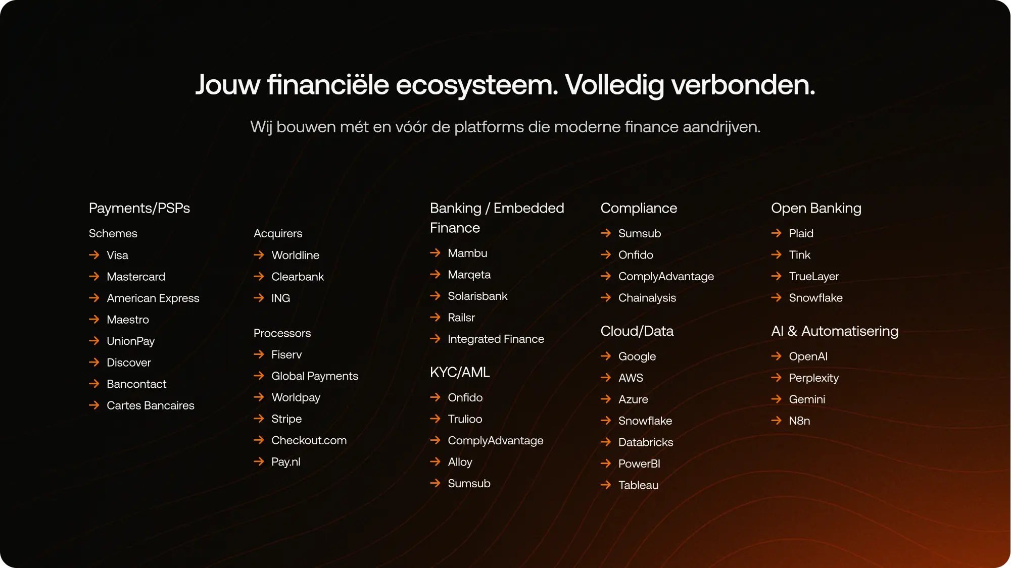 Core/ledger, PSP’s, KYC/KYB, AML-stacks, PCI-workflows, directe uitbetalingen (Visa Direct / Mastercard Send).